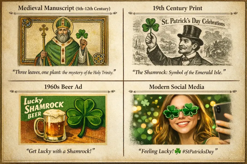 Shamrock appeared on beer labels (Guinness, from 1862 onwards). It became decoration on diaspora postcards and greeting cards. The original theological meaning was effectively forgotten; the visual identity was memorized instead.