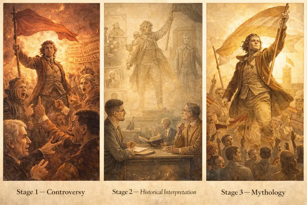Stage 2 (Generational Transition): As direct witnesses die, the figure becomes subject to historical interpretation rather than lived memory. Scholarly debates continue, but cultural memory begins to simplify.